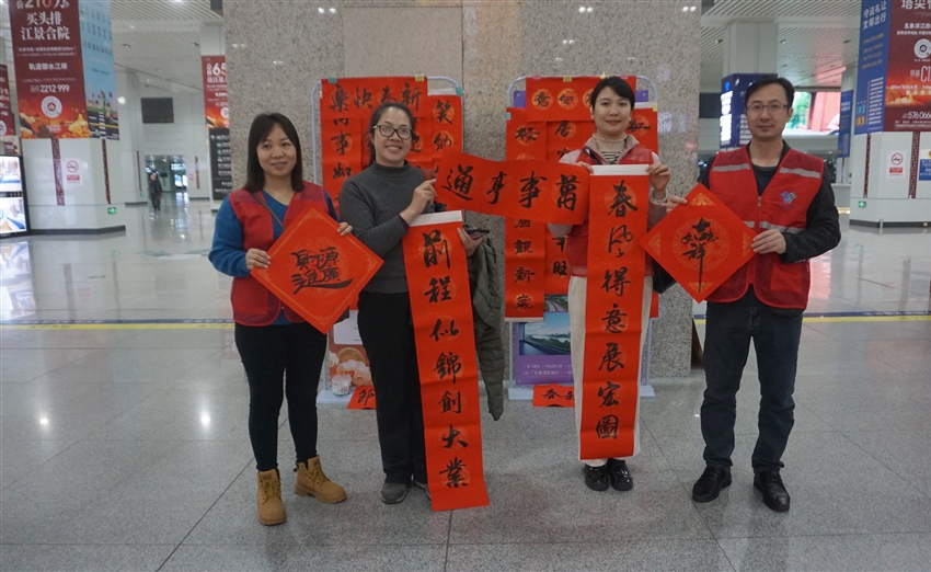活動(dòng)現(xiàn)場(chǎng),一幅幅提前寫(xiě)好的春聯(lián)福字整齊排列,散發(fā)著陣陣墨香,傳遞著濃濃的節(jié)日氛圍。黨員志愿者們?cè)谌巳褐?/span>忙碌穿梭,熱情地將飽含新春祝福的春聯(lián)與寓意滿滿的福字到過(guò)往旅客、車(chē)站工作人員和出租車(chē)司機(jī)手中。一位拖著行李的旅客接過(guò)春聯(lián)感動(dòng)地說(shuō)“這大紅的春聯(lián)和福字,一下子就讓回家的路充滿了年味!”車(chē)站工作人員和司機(jī)們也紛紛表示,這份禮物十分貼心,讓他們心里暖洋洋的。